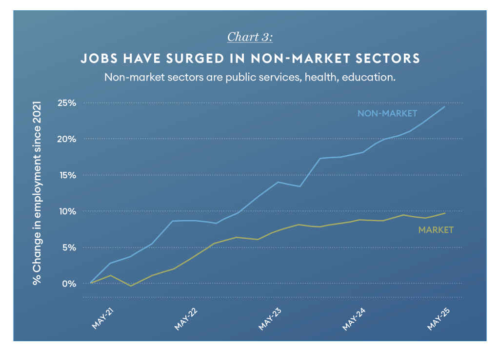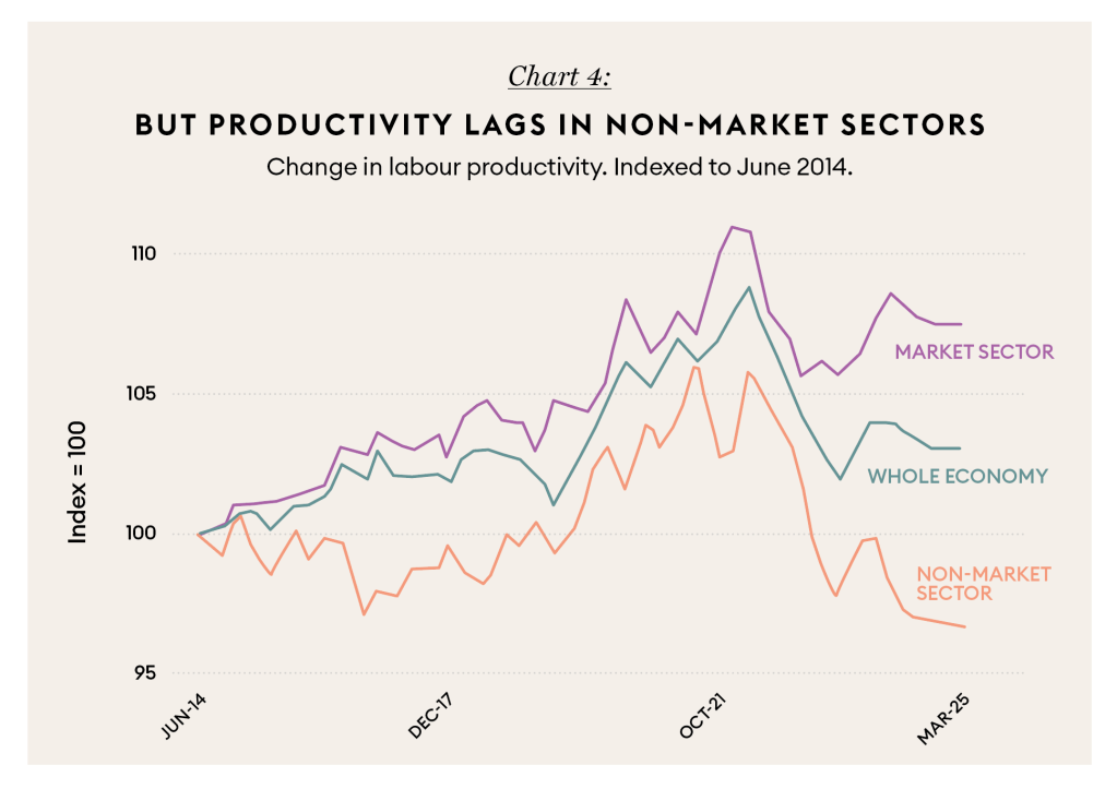 Chart 1 excludes three industries: public services, health, and education. These are ‘non-market’ sectors because output is measured by costs, not prices. Together, they are one of the fastest-growing parts of Australia’s economy. Since 2021, employment has surged collectively by 24% – more than twice the 9.6% growth in market sectors (Chart 3). But, while they are using more labour, these sectors are failing to deliver results. Analysis by the Productivity Commission shows non-market sectors going backwards on labour productivity since 2014. (Chart 4)