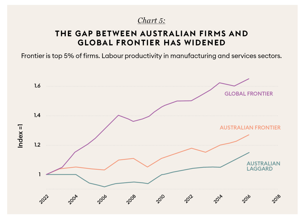 The Federal Treasury compared Australian firms in manufacturing and services with the top 5% of global performers in those industries, known as the “global frontier” (Chart 5). It found a widening labour productivity gap, suggesting Australian businesses are slower to adopt new technologies and processes. Between 2002 and 2016, labour productivity among global frontier firms rose 60%, compared to just 25% for Australia’s top firms. The rest (labelled “laggards”) managed only 15%.