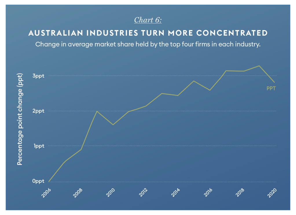 The Treasury also warned of weakening competitive pressure, as Australian industries turn more concentrated. This may have “lowered the impetus for firms to adopt new technologies and improve their productivity,” it said. Research by the e61 Institute shows the average market share held by the top four firms in each industry (known as the CR4) climbed by about 2.5 percentage points between 2007 and 2020 (Chart 6). Industry-level analysis reveals that concentration in Australia far outstrips that in the United States, with the top four firms capturing a larger share of sales across multiple sectors – clear evidence of market dominance. (Chart 7).