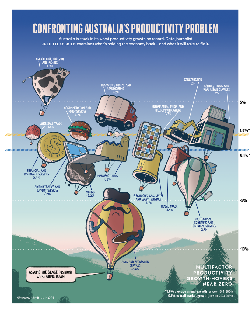 Australia is stuck in its worst productivity growth on record. Data journalist Juliette O’Brien examines what’s holding the economy back – and what it will take to fix it.