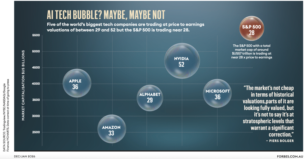 Thinking about how much it’s spending on AI along with other corporations, yes, the overall multiple of these businesses is high relative to, let’s say, what the S&P was over the past 20 years, but it’s not necessarily high [relative to] its individual history. As their market caps have grown, because people are investing, clearly, the valuation on the market has increased. If you actually looked at the S&P on an equally market-cap-weighted basis, it’s really trading at 17 to 18 times forward earnings, not necessarily the 22 to 23 times that we are looking like at the moment. From our perspective [that] gives us a view that yes, the market’s not cheap in terms of historical valuations, parts of the market are looking fully valued, but it’s not to say that the market is at stratospheric levels that warrant a significant correction.