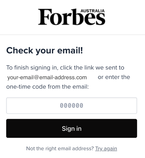 In the sign-in window, enter the email address associated with your Forbes Australia account and click “Send sign-in link.”