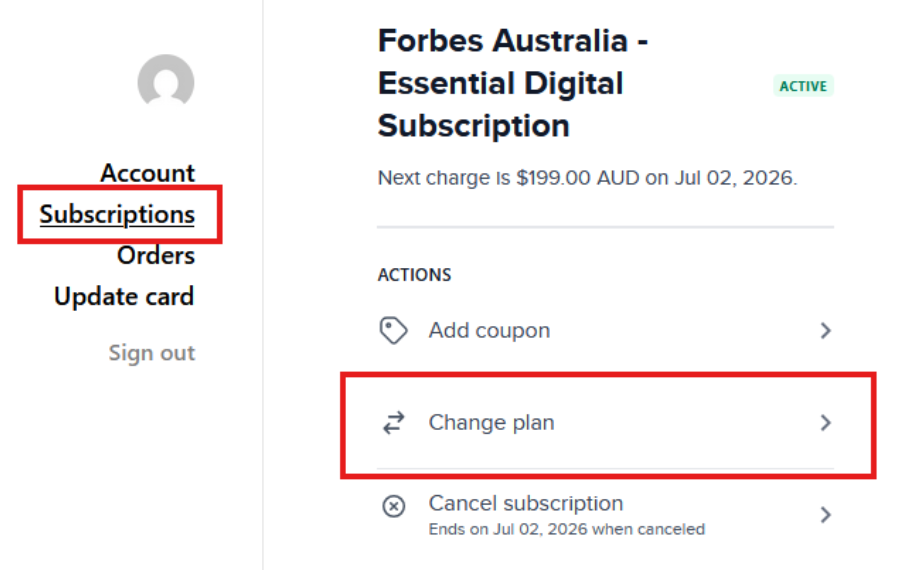 Follow these simple steps to upgrade your Forbes Australia subscription plan (for example, from Essential Digital to Premium):