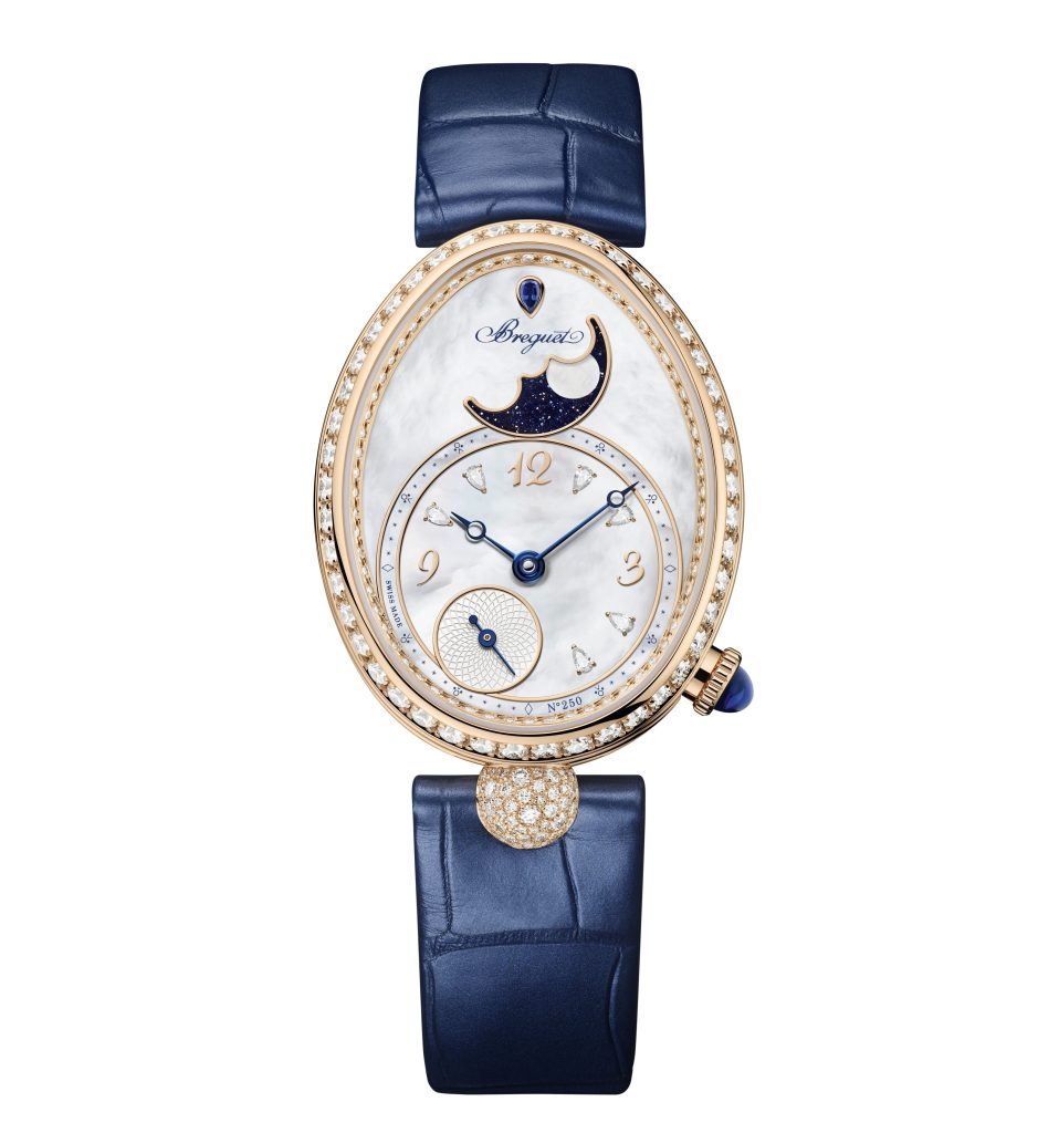 Created to mark Breguet’s 250th anniversary, the Reine de Naples 9935 brings a modern glow to one of watchmaking’s most storied feminine icons, with an enlarged moon phase, pear-shaped diamonds and luminous mother-of-pearl.