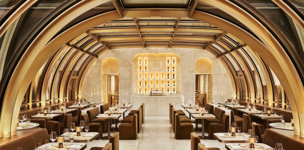 The incredible lobster roll at RH’s chic, seafood dominated Le Jardin is alone worth a visit. The restaurant, located on the second floor terrace, under a spectacular curved glass and steel structure inspired by the Grand Palais is one of three food and beverage offerings in American luxury interiors company RH, previously called Restoration Hardware. The billion-dollar lifestyle brand has just opened its inaugural European flagship on the Avenue des Champs-Élysées, featuring an impressive seven-story gallery spanning 3,900 square meters. Visitors might remember the address for Abercrombie & Fitch but the building underwent a major transformation led by architects Foster + Partners. If you don’t dine at Le Jardin, Le Petit is a lovely roof garden terrace restaurant on the seventh floor with great views of the Eiffel Tower, Grand Palais and the Louvre, or for drinks, sink into one of their legendary sofas and enjoy a glass of champagne or cocktail in The World of RH Bar.