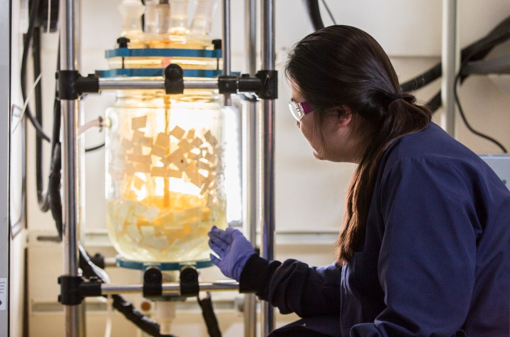 In the BioCellection laboratory, Miranda Wang observes a chemical process to transform plastic.