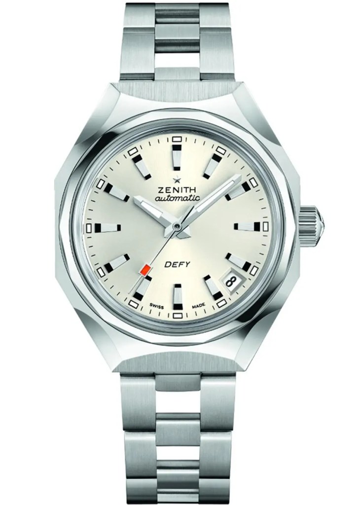 Among the brand’s more quirky watches is the Defy Revival A3643, inspired by a design from 1969. It was newly launched in 2022 with a modern automatic movement (Zenith Elite caliber 670) and has appeared with black, red or gradient brown dials in the past. A new silver toned dial, with a vivid orange seconds hand, gives the vintage design a whole new look: cleaner and purer. $7,800