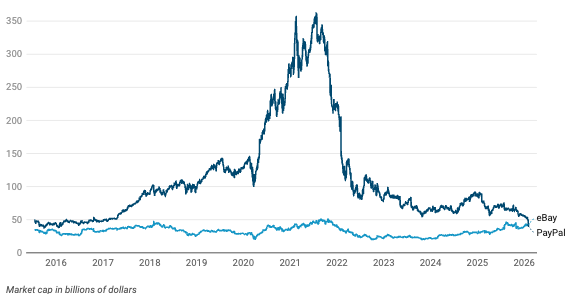 For years, PayPal looked like the clear winner. At the time of the split, eBay was valued at about $35 billion. PayPal was worth about $49 billion. During the pandemic boom in July 2021, PayPal’s market cap climbed to about $360 billion pushing the gap between the two companies to a record $315 billion while making PayPal eight times larger than eBay.