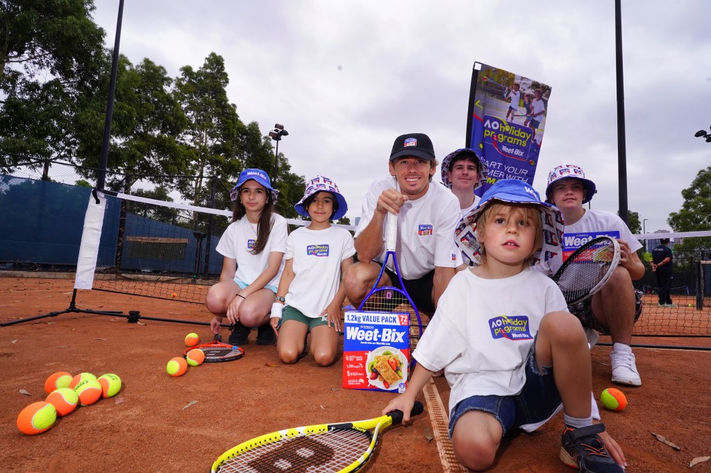 January 14: Alex de Minaur (AU) meets five ‘Weet-Bix kids’ during Opening Week of the 2026 Australian Open. Photo by TENNIS AUSTRALIA/LUIS ENRIQUE ASCUI